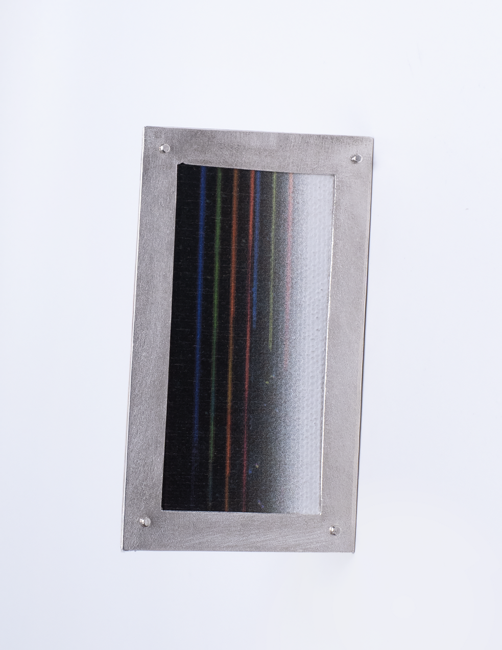 The canvas sections provided by Mladen Bizumic are samples of his large-format photo prints, which depict reflections of scanned mirror pieces as a prismatic color gradient. Ela Nord placed the result of this play of light and backlight in a matt silver frame so that the resulting brooches look like abstract paintings.